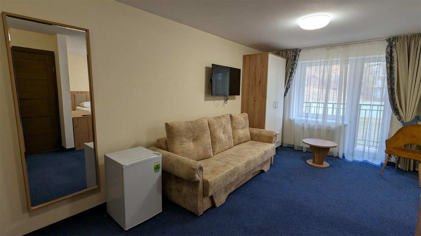 Светлый и уютный номер категории «Комфорт семейный» – это отличный выбор для семьи с детьми или компании близких друзей. Номер отличается современным дизайном и спокойной атмосферой. Просторные однокомнатные номера с раскладными диванами рассчитаны на проживание от 1 до 4 человек. В номерах есть Wi-Fi, кабельное ТВ, холодильник и светильники, рабочее место, стул, диван, кофейный столик, кресло и телевизор. Дополнительно в номер можно заказать детскую кроватку с детским постельным бельем, напольные весы, еду в номер.